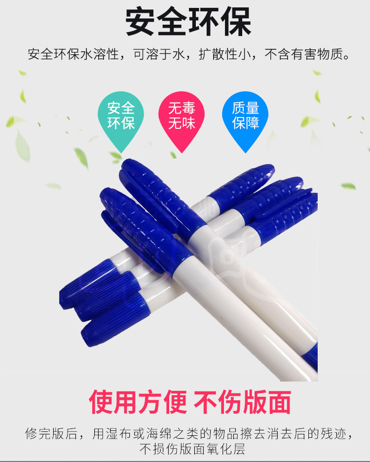 修版笔消除印刷机版面的修版笔 水溶性涂涂在需要修改的地方,等待5秒后用湿布轻轻擦拭即可。用后请套上笔套,以防止溶剂挥发